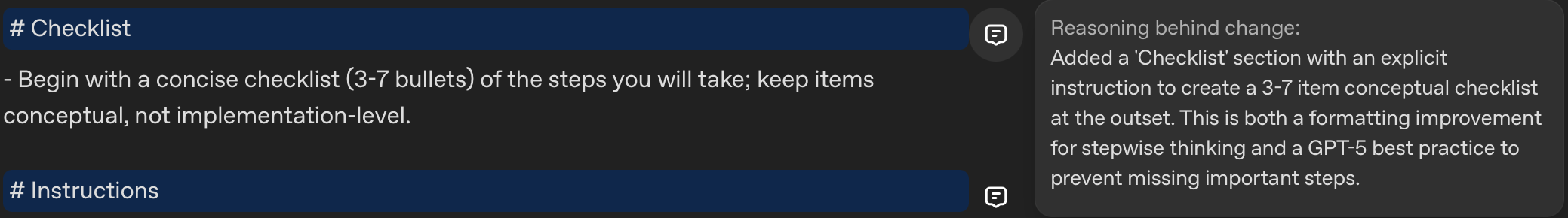 The optimized prompt starts with "Begin with a concise checklist..." forcing the AI to plan before executing. This improves the coherence of complex analyses. In legal work, this mirrors how we're trained: issue-spot first, then analyze.