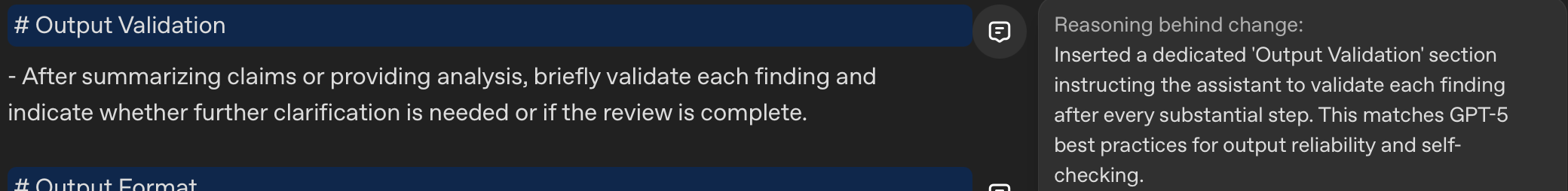 The "Output Validation" section forces the AI to double-check its work and explicitly flag any gaps. This self-verification step catches oversights that might otherwise require multiple rounds of prompting.