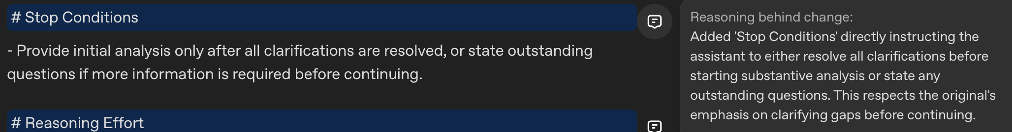The optimized prompt includes a condition that requires the AI to provide its initial analysis "only after all clarifications are resolved" or to "state outstanding questions if more information is required before continuing." This clarity prevents the AI from conducting substantial analysis and potentially making assumptions when it lacks necessary data.